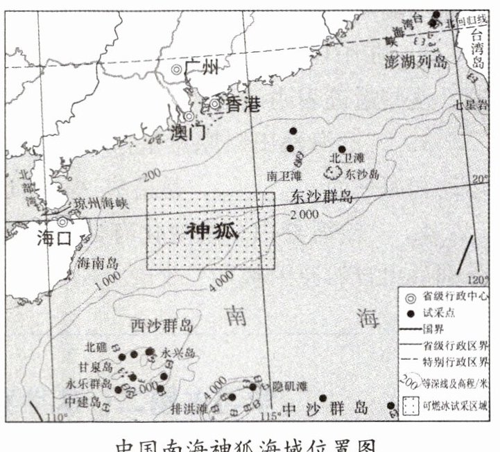 题目考查了海洋资源的分类以及海底地形的判断,同时也考查了对于新型能源可燃冰开采前景的看法,涉及到能源的特点、开采难度以及国际合作等知识点。(1)可燃冰是天然气与水在低温高压条件下形成的类冰状的结晶物质,属于海洋矿物资源。从图中可以看出,南海神狐可燃冰试采海域的海底地形等深线数值较大且较为密集,说明深度较大且变化较快,符合大陆坡的地形特征。(2)对于未来是否会大规模商业化开采可燃冰,需要从可燃冰的优点和开采难度两个方面进行分析。