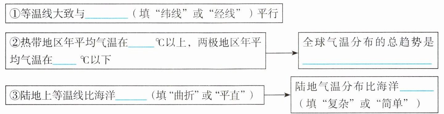 ③陆地上等温线比海洋______(填“曲折”或“平直”)