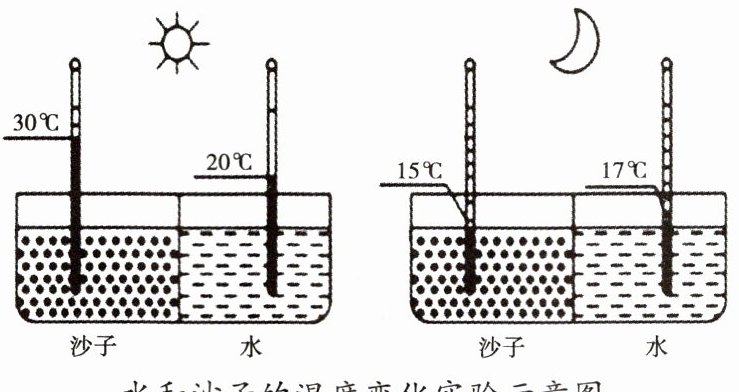 (2)晚上没有太阳照射,沙子的温度是$15^{\circ}C$,水的温度是$17^{\circ}C$,所以晚上沙子比水温度低。这证明在相同条件下,沙子降温更快。