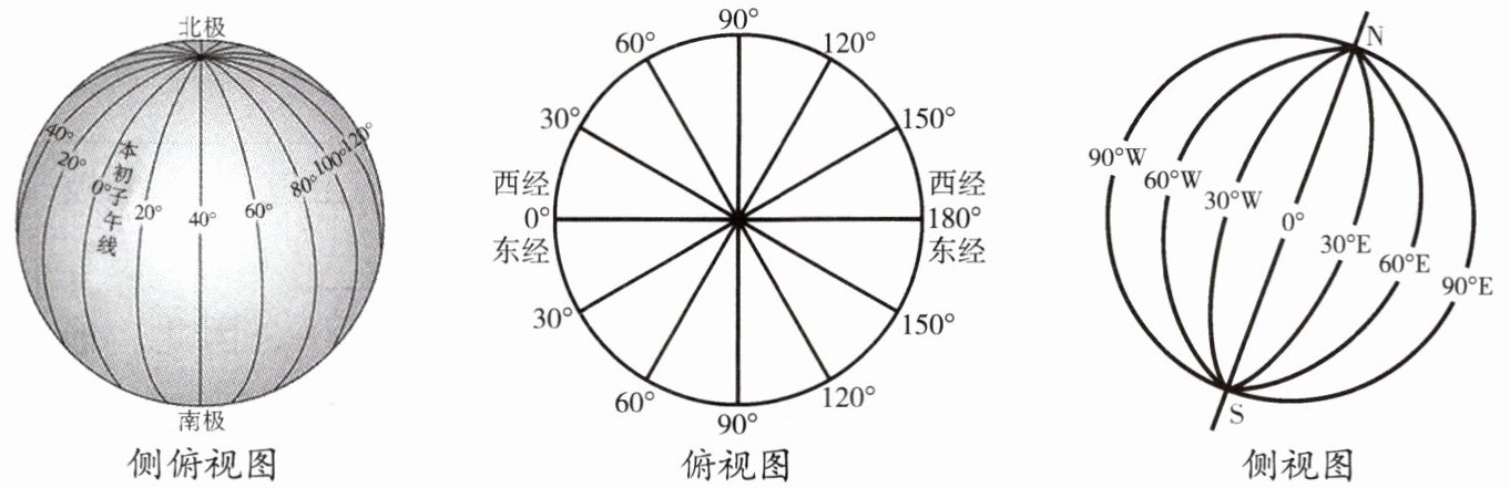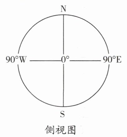 1.侧视图中两条经线间隔$90°$,$45°E$和$45°W$两条经线分别位于$0°$经线(本初子午线)东、西两侧,且与之间隔$45°$。图略。