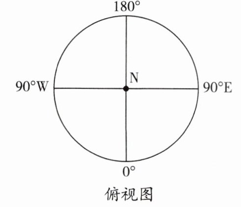 2.俯视图中两条相邻经线间隔$45°$,$45°E$位于$0°$经线以东$45°$,$135°W$在$180°$经线以西$45°$(或$0°$经线以西$135°$)。图略。