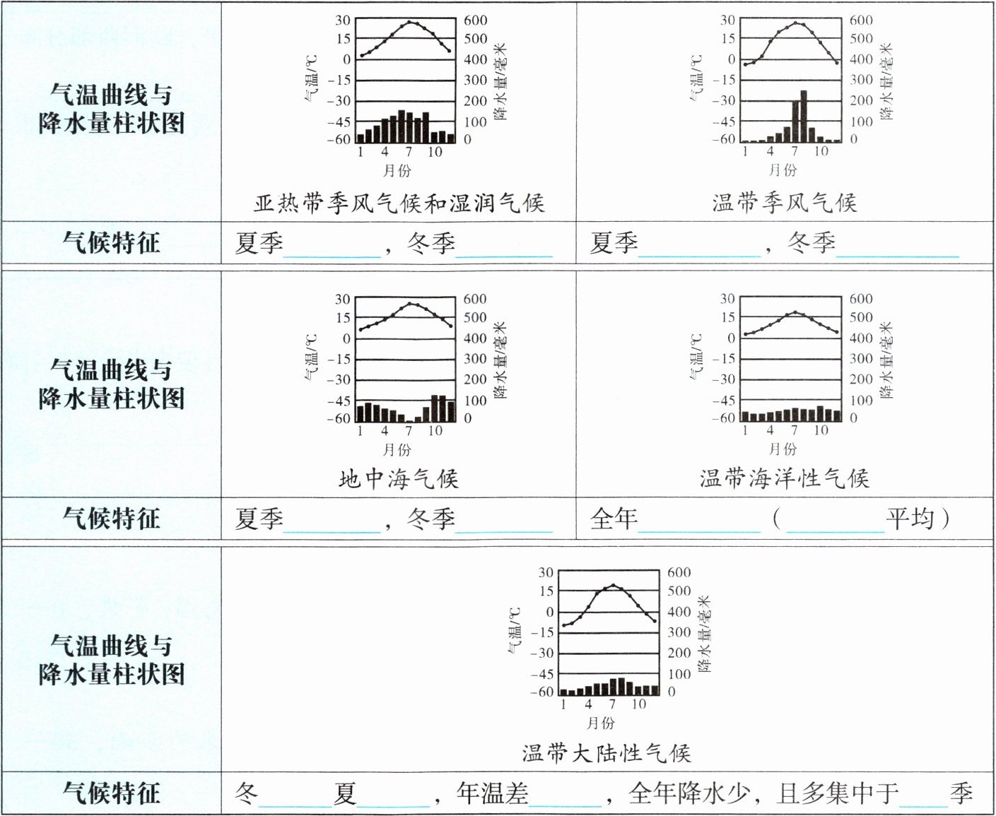 二、读下面不同气候类型的直方图,描述各气候类型的特征。