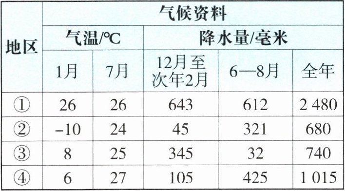 选项D,④地区夏季高温多雨,冬季温和少雨,1月气温在6℃左右,7月气温高,降水集中在夏季,这更符合亚热带季风气候的特点,而不是温带海洋性气候。温带海洋性气候的特点是全年温和湿润,降水分配较为均匀,且最冷月气温通常在0℃以上但远低于亚热带季风气候的冬季气温,故D错误。