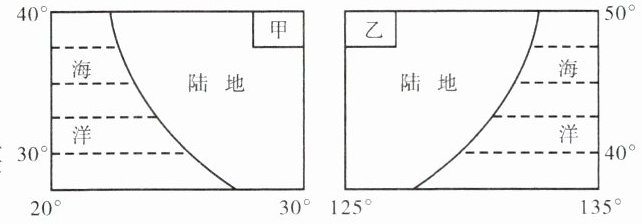 乙地位于$35^{\circ}N - 55^{\circ}N$的大陆东岸。