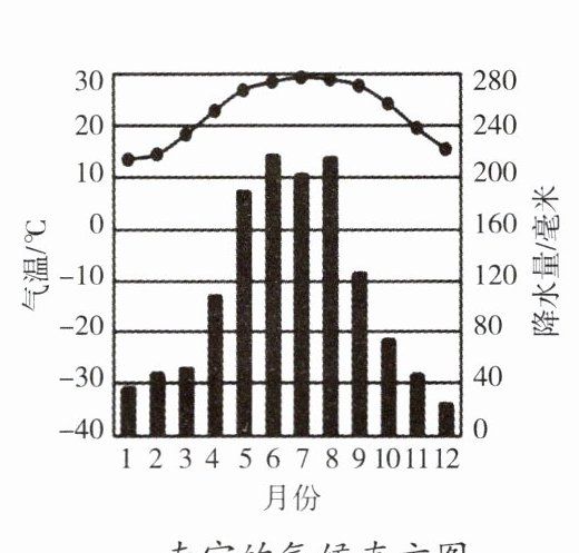 (1)热带的纬度范围是$23.5^{\circ}N-23.5^{\circ}S$,北温带的纬度范围是$23.5^{\circ}N-66.5^{\circ}N$,北寒带的纬度范围是$66.5^{\circ}N-90^{\circ}N$,南温带的纬度范围是$23.5^{\circ}S-66.5^{\circ}S$,南寒带的纬度范围是$66.5^{\circ}S-90^{\circ}S$。由此可知,南宁跨热带和北温带。从南宁的气候直方图可以看出,南宁夏季高温多雨,冬季温和少雨,属于亚热带季风气候。