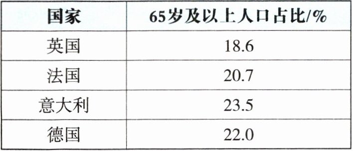 一般认为,一个国家或地区65岁及以上人口占比超过7%即进入老龄化社会。欧洲是世界上人口老龄化非常严重的地区,右表为某年欧洲部分国家65岁及以上人口占比统计。读表,完成6—7题。