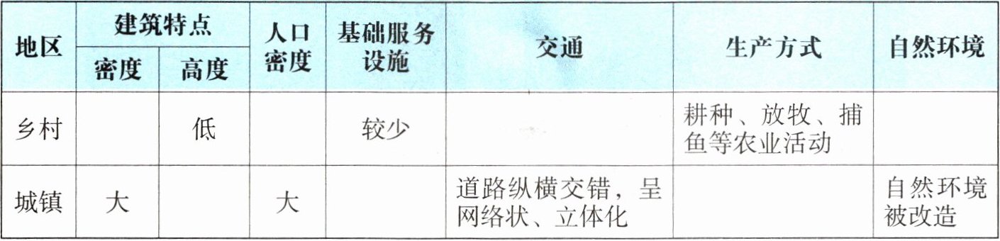 |城镇|大|______|大|______|道路纵横交错,呈网络状、立体化|______|自然环境被改造|