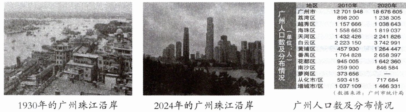 读上述图表材料,说一说广州的变化:人口规模扩大,城区边界向外扩展,建筑层数增加,配套服务设施完善,交通道路网密集。