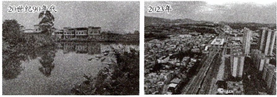 读“广州市增城区朱村不同时期的景观”图,说一说乡村的变化:乡村的道路______,基础服务设施不断______,人们的生活方式与城镇更加______,乡村景观______。