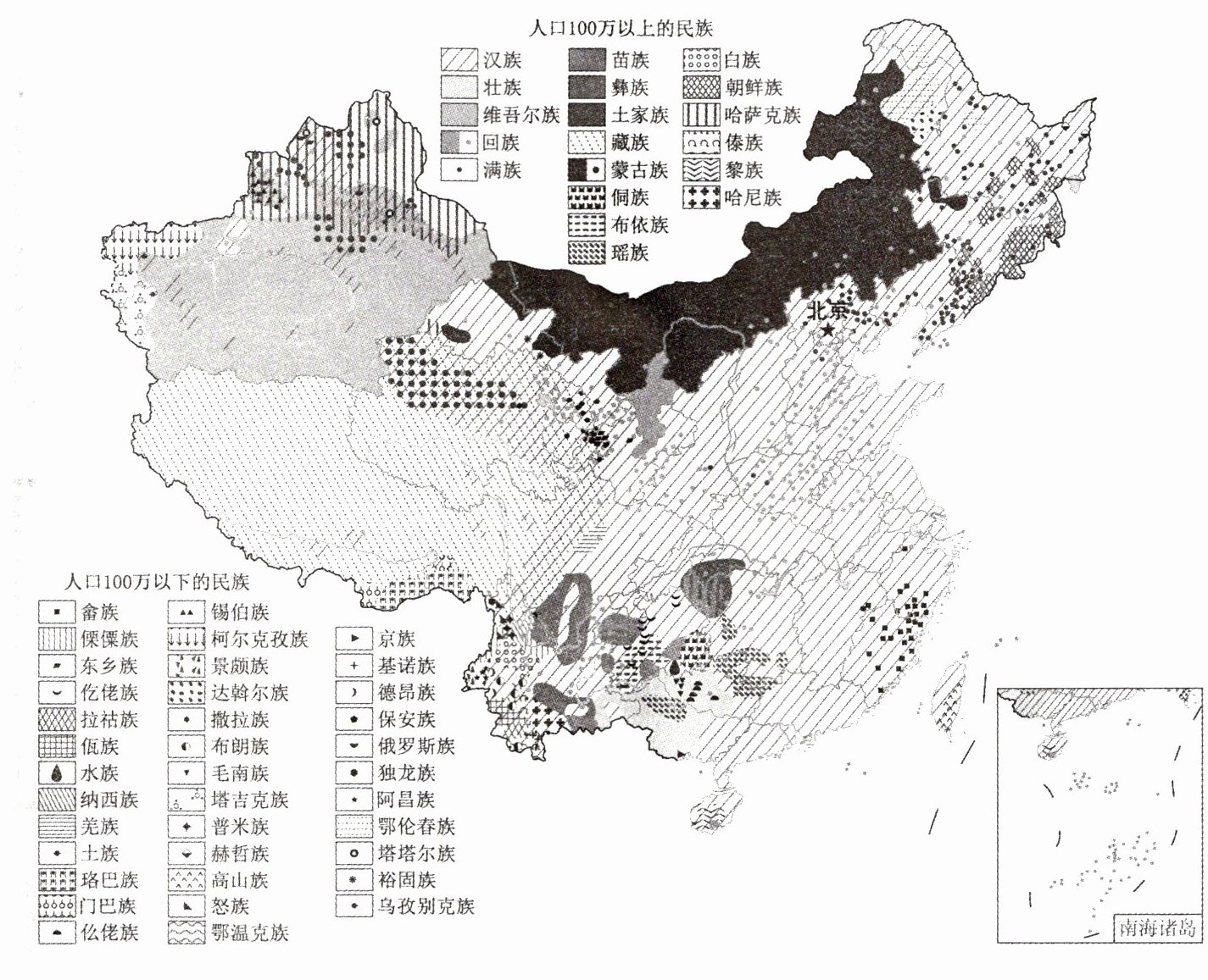 读“中国民族的分布”图可知,汉族人口遍布全国各地,少数民族人口相对集中在____、____和____等地区。我国民族分布具有“____”的特点。