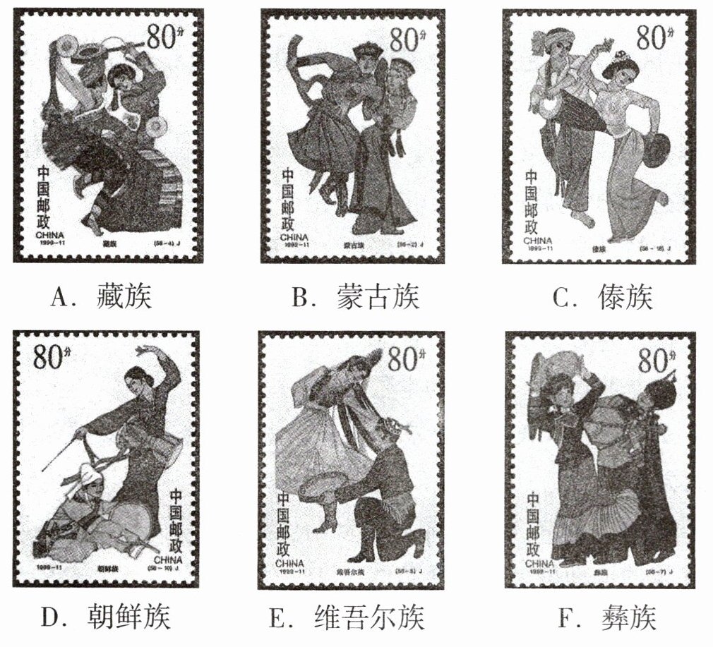 10. “只有民族的才是世界的”,我国少数民族独特的风俗习惯和文化艺术是祖国灿烂文化的重要组成部分,同时又成为得天独厚的旅游资源。请将下列民族风情代表的民族编号填到下页表格相应的位置。