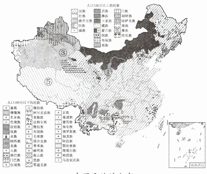 (3)分布在图中④、⑤两地主要的少数民族分别是____族和____族。