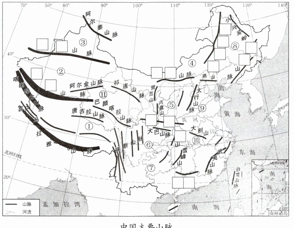 ①喜马拉雅山脉;②昆仑山脉;③天山山脉;④阴山山脉;⑤秦岭;⑥雪峰山;⑦横断山脉(或南北走向山脉,位置合适即可);⑧长白山脉;⑨太行山脉;⑩武夷山脉;⑪祁连山脉