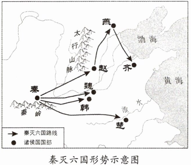 秦灭六国之战,指战国末期,实力最强大的诸侯国秦国消灭其他六个诸侯国,完成统一中国的战争。读右图,完成1—2题。
