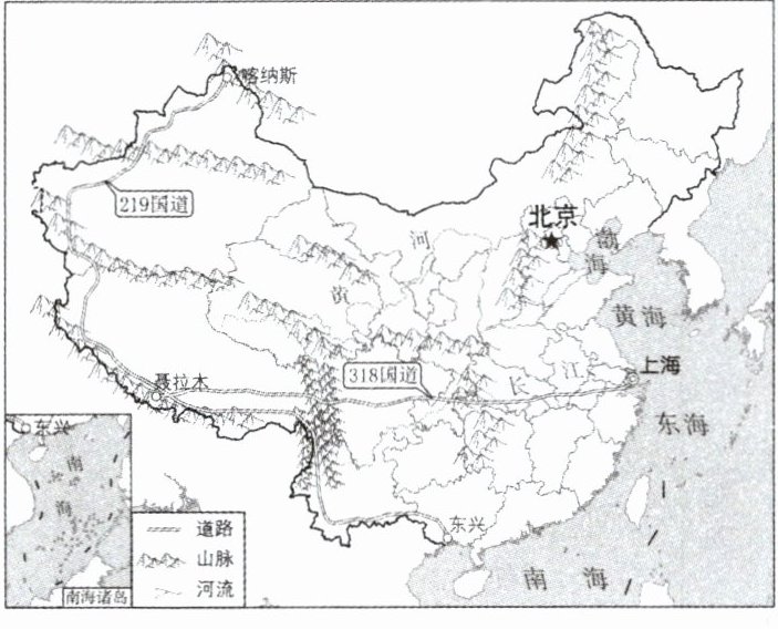 国道是指具有全国性政治、经济意义的主要干线公路。318国道起于上海,止于西藏,有“中国的景观大道”之称。219国道南起广西东兴,北至新疆喀纳斯,是世界上海拔最高、最艰险的高原公路。读右图,完成3—5题。
