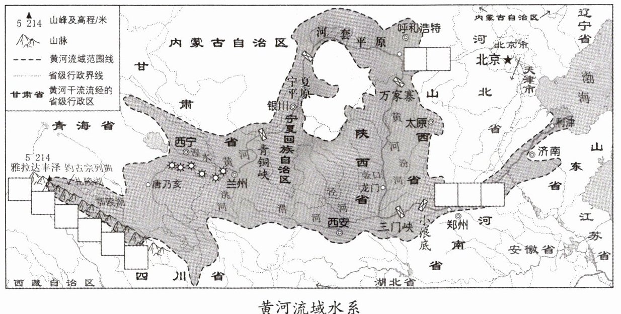 1. 请在图中相应的空格内填注巴颜喀拉山脉及黄河上、中、下游分界点(河口、桃花峪)的名称。