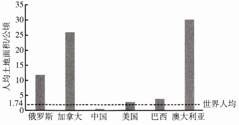 读“世界面积前六的国家人均土地面积(2020年)”图,回答第1题。