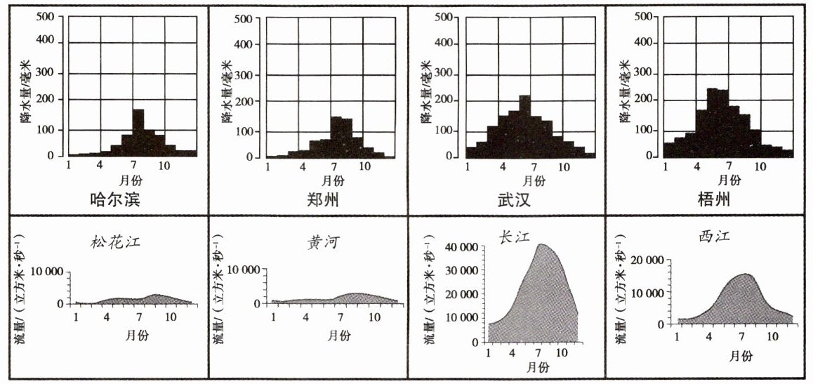 中国东部主要城市多年平均各月降水量及主要河流流量年变化曲线示意图