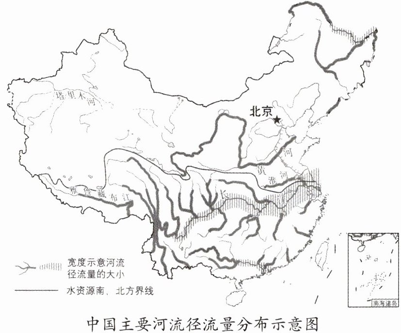 1. 读“中国主要河流径流量分布示意图”,认识水资源空间分布特点。从空间分布看,我国水资源具有