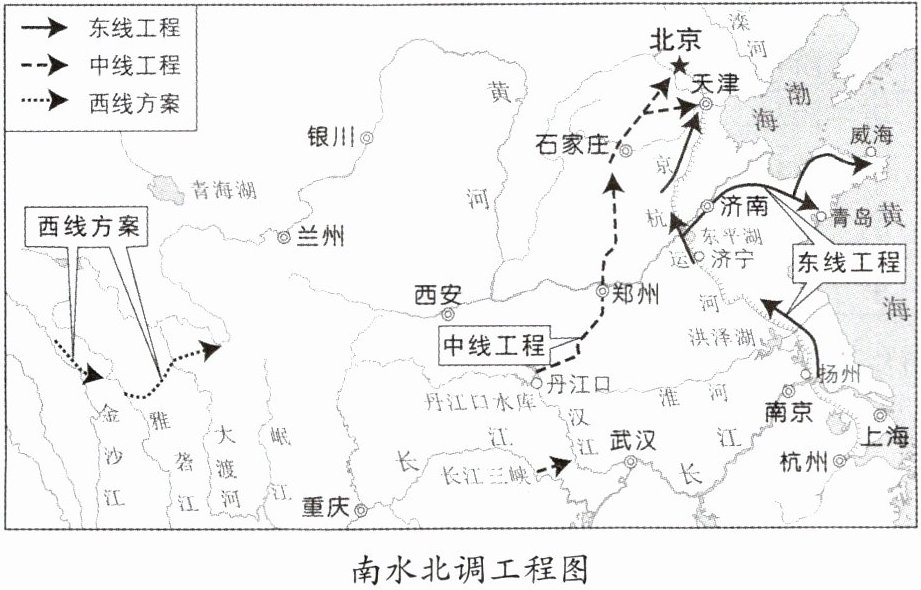 9. 南水北调工程是世界上规模最大的调水工程。读“南水北调工程图”,回答下列问题。
