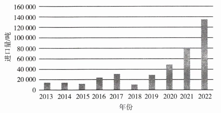 锂是自然界最轻的金属,性能优良,一般不会独立形成矿物,而是分布于造岩矿物和盐湖中。中国已成为全球第一大锂资源消费国,但国内锂资源供给不足,对外依存度达67%。读“2013—2022年中国碳酸锂进口量变化图”,完成3—5题。