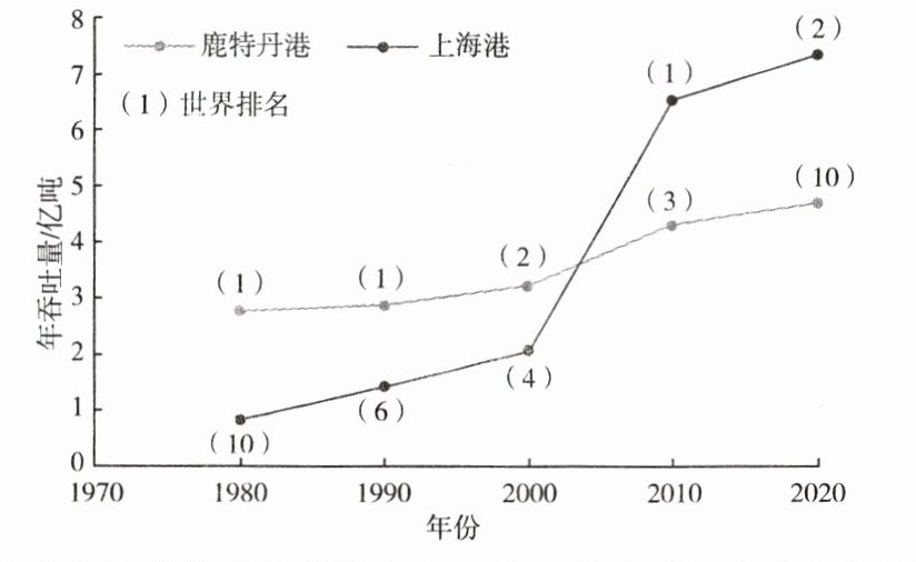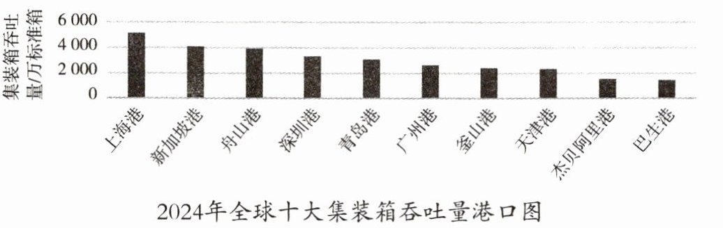 2024 年,我国全国港口货物吞吐量达 176 亿吨,集装箱吞吐量达 3.3 亿标准箱,继续稳居世界第一。截至 2024 年底,全球货物吞吐量和集装箱吞吐量排名前十的港口中,我国分别占八席和六席。下列图片分别示意 2024 年全球十大集装箱吞吐量港口和上海港与鹿特丹港货物年吞吐量及其世界排名的变化。