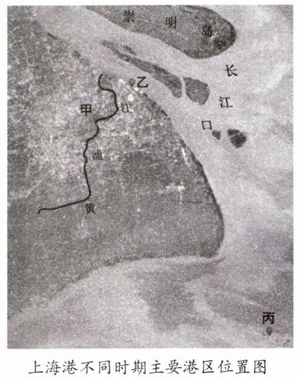 2023 年,上海港集装箱吞吐量连续 14 年位居世界第一,其中“水水中转”比例接近 60%。右图中甲、乙、丙示意上海港不同时期主要港区位置。据此完成 6—8 题。
