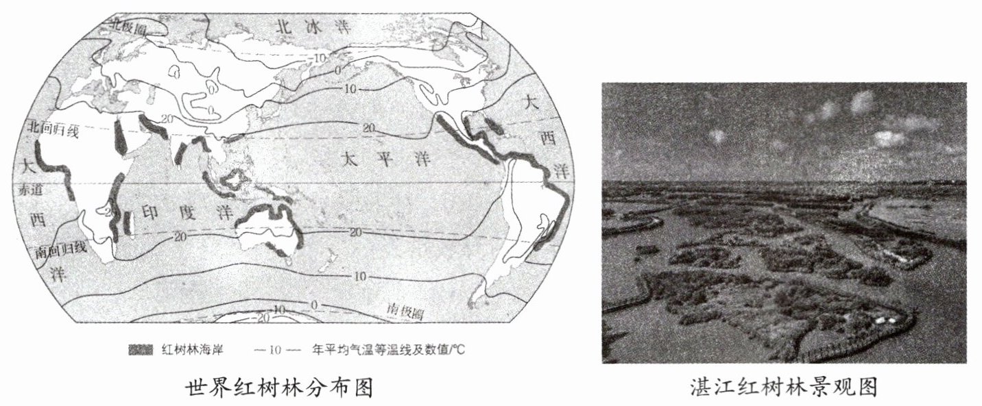 红树林生长在受到潮水周期性浸淹的海岸地带,具备净化海水、防风消浪、固碳释氧、维持生物多样性等功能,有“海上森林”“海洋卫士”之称。广东省湛江市红树林面积达 7242 多公顷,是我国最大的红树林自然保护区。下列图片分别示意世界红树林分布和湛江红树林景观。