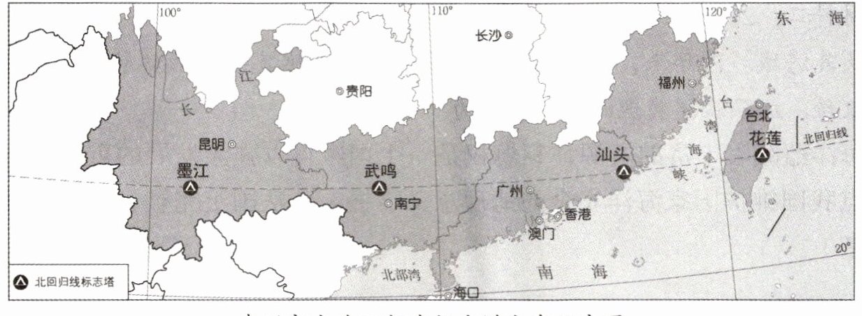 8. 读“我国部分北回归线标志塔分布示意图”,图中建有回归线标志塔的省级行政区简称从西到东分别是(