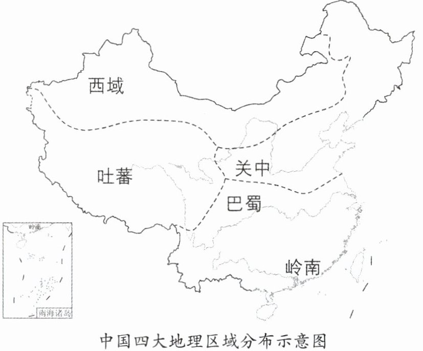 中国古代文人喜欢从文化相似性着手,辅之以山川,划分出许多充满历史韵味的地理区域,如“关中”“岭南”“巴蜀”“西域”“吐蕃”等。读图,完成1—2题。