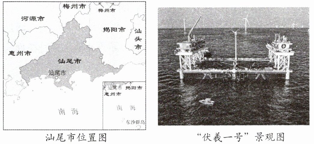 材料二:“伏羲一号”位于距汕尾海岸约11千米处的海域,采用全球首创漂浮式动力定位技术抵御超强台风,通过综合多营养水产养殖系统智能化管理,是全球单体最大抗台风型风渔融合网箱平台,集成风能发电、海水养殖、渔业加工等多种功能。下列图片分别为汕尾市位置图和“伏羲一号”景观图。