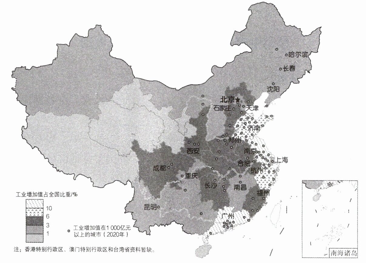 读“中国各省级行政区工业增加值的全国占比及主要工业城市分布图”,了解我国工业分布的情况,回答下列问题。