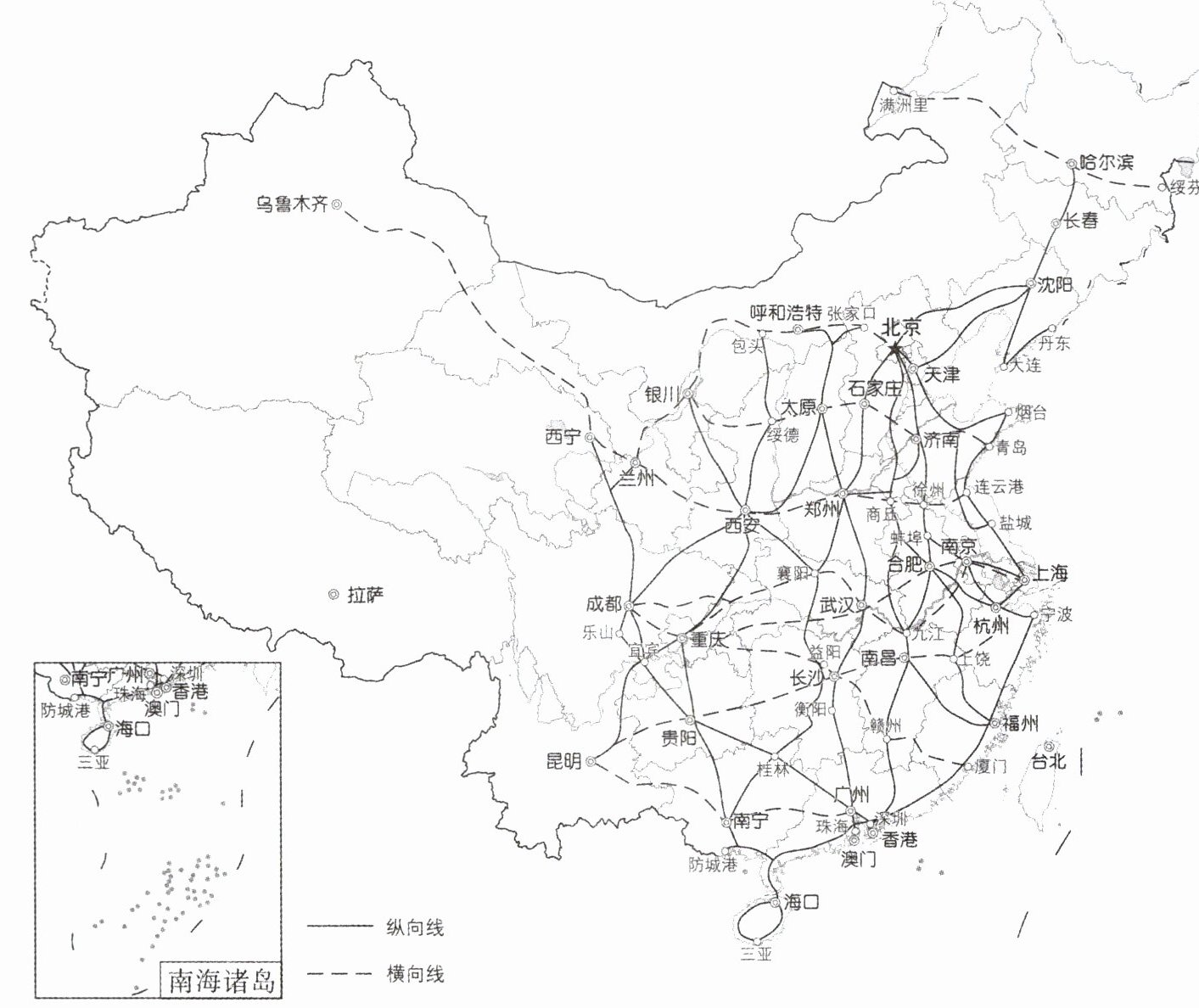 读“中国中长期高速铁路网规划(2016—2030年)”示意图,回答下列问题。