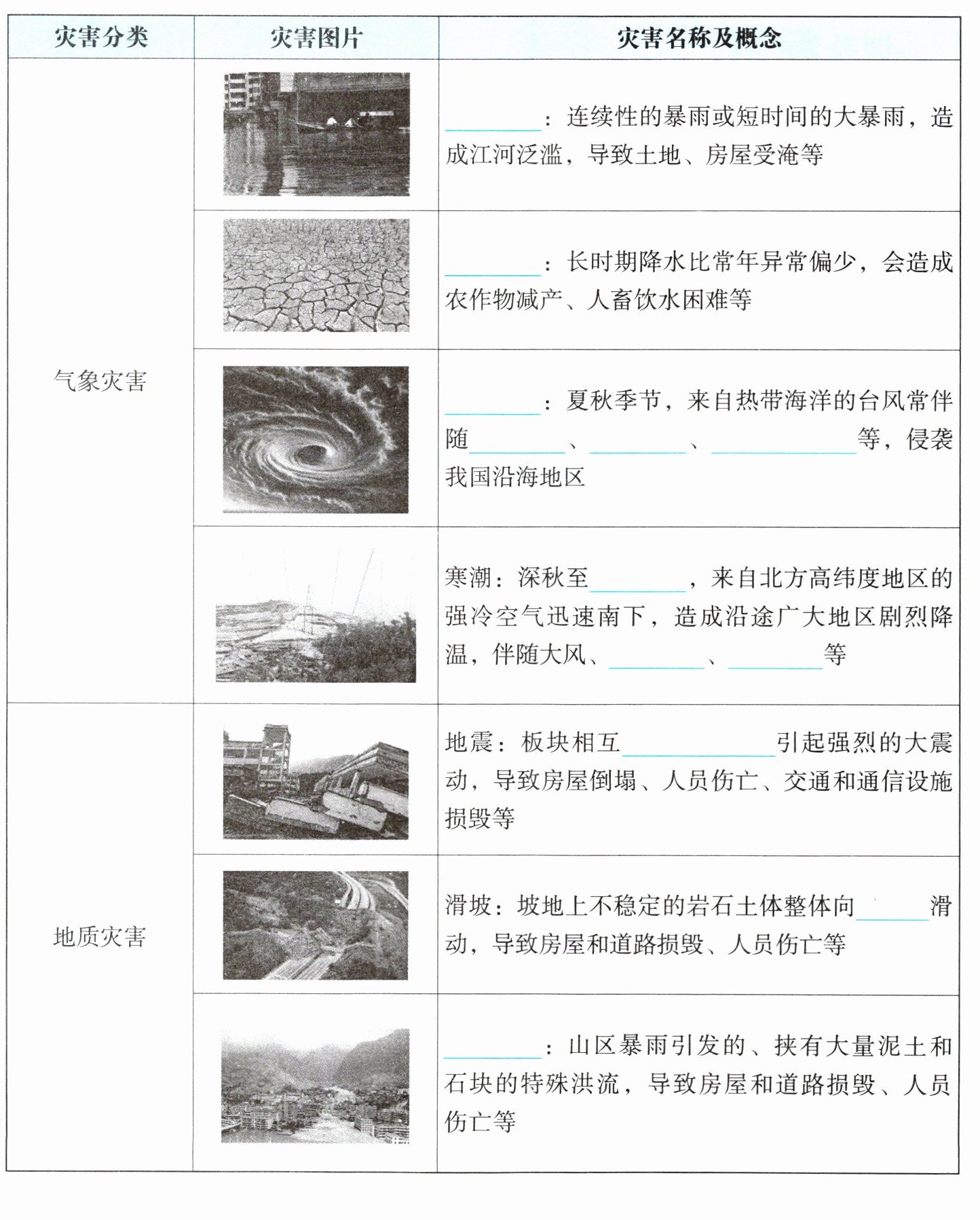 (1)气象灾害:洪涝、寒潮、冰雹、旱灾、台风 地质灾害:泥石流、滑坡、地震