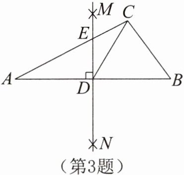 3. 如图,在$\triangle ABC$中,分别以A和B为圆心,以相同的长(大于$\frac{1}{2}AB$)为半径作弧,两弧相交于点M和点N,作直线MN交AB于点D,交AC于点E,连结CD。若$\triangle CDE$的面积为9,$\triangle ADE$的面积为12,则四边形EDBC的面积为______。