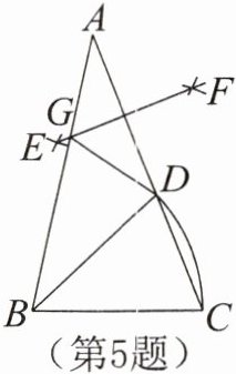 5. 如图,在$\triangle ABC$中,AB= 5,BC= 3,以B为圆心,BC长为半径画弧,与AC交于点D,再分别以A,D为圆心,大于$\frac{1}{2}AD$的长为半径画弧,两弧交于点E,F,作直线EF,交AB于点G,连结DG,求$\triangle BDG$的周长。