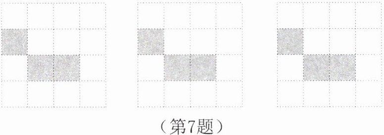 7.如图是由三个小正方形(灰色)组成的图形,请你在三个网格图中,各补画出一个有阴影的小正方形,使补画后的图形为轴对称图形。