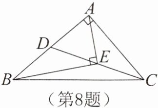 8. 如图,在Rt△ABC中,∠BAC= 90°,AB= 4,CD是△ABC的中线,E是CD的中点,连结AE,BE,若AE⊥BE,垂足为E,求$AC^2$的值。