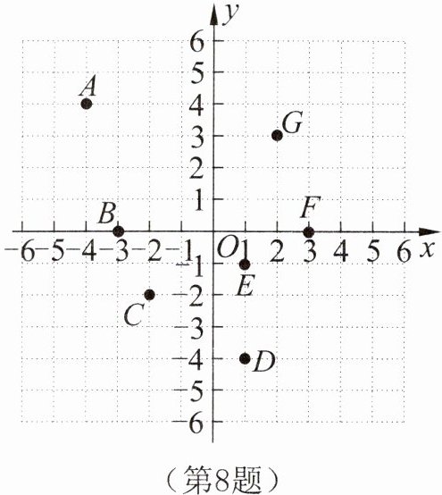 8.如图,写出点A,B,C,D,E,F,G的坐标以及它们所在的象限或者坐标轴。