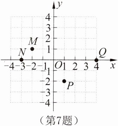 7.老师在黑板上写了四个点,M(2,1),N(-3,0),P(1,-2),Q(0,4),嘉淇将这些点描在如图所示的平面直角坐标系中,请圈出其中所描位置有错误的点并将其描在正确的位置上。