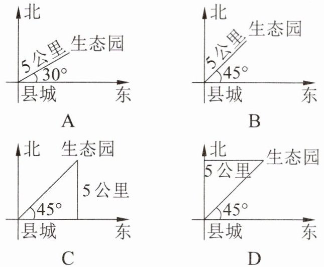 2. 生态园位于县城东北方向5公里处,如图表示准确的是( )