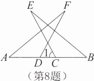 8. 如图,△ADF≌△BCE,∠B= 40°,∠F= 22°,BC= 2cm,CD= 1cm。