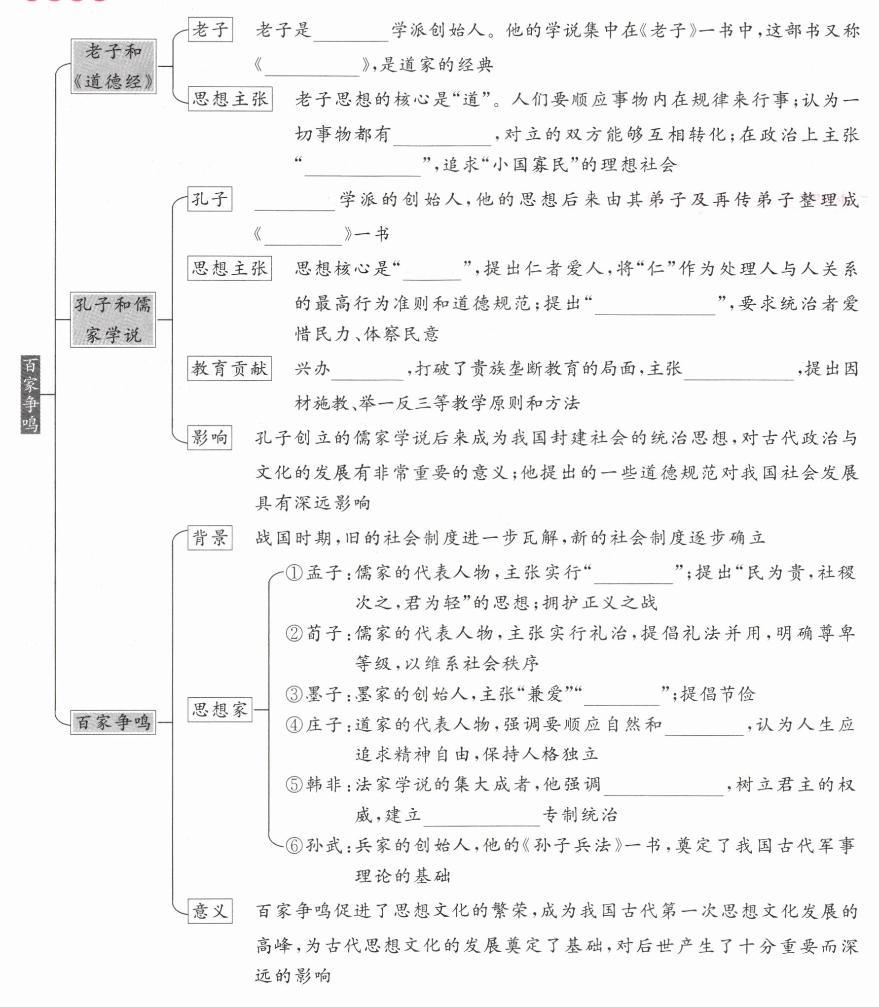 道家;《道德经》;对立面;无为而治;儒家;《论语》;仁;为政以德;私学;有教无类;仁政;非攻;民心;以法治国;中央集权。