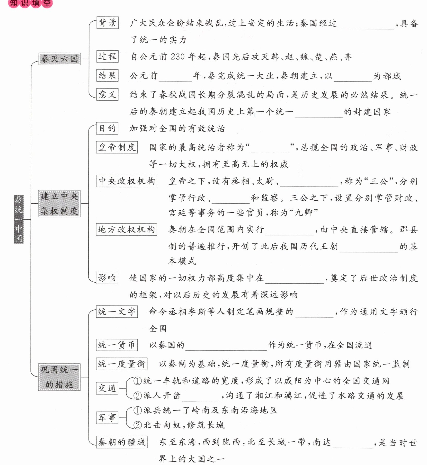 商鞅变法;221;咸阳;多民族;皇帝;御史大夫;军事;郡县制;地方行政制度;皇帝手中;小篆;圆形方孔半两钱;灵渠;南海。