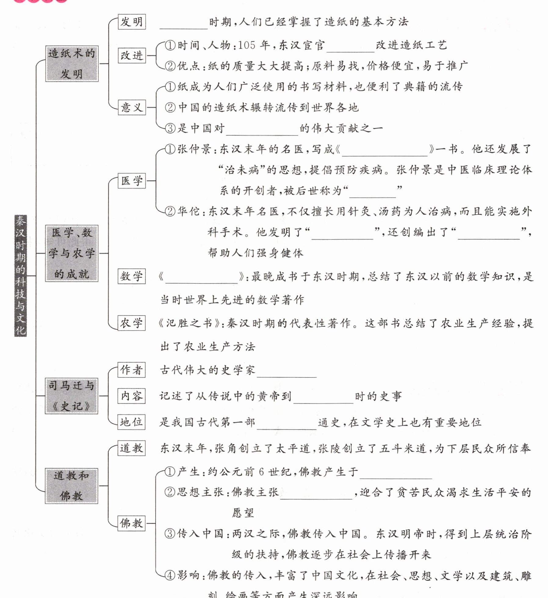 故答案依次为:西汉;蔡伦;世界文明;伤寒杂病论;医圣;麻沸散;五禽戏;九章算术;司马迁;汉武帝;纪传体;古印度;众生平等。