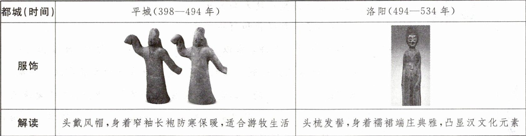 (1)变化:由充满鲜卑特色变为充满汉服元素。(2分)原因:北魏孝文帝改革推行汉化政策,以汉服代替鲜卑服。(2分)