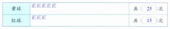 (1)两人一组做摸球游戏。一人在不透明的口袋里放入红、黄两种颜色的球共6个(不让另一人知道其中有几个红球、几个黄球),另一人每次任意摸出1个球,摸后放回,一共摸40次。在下表中记录每次摸出的是什么球。