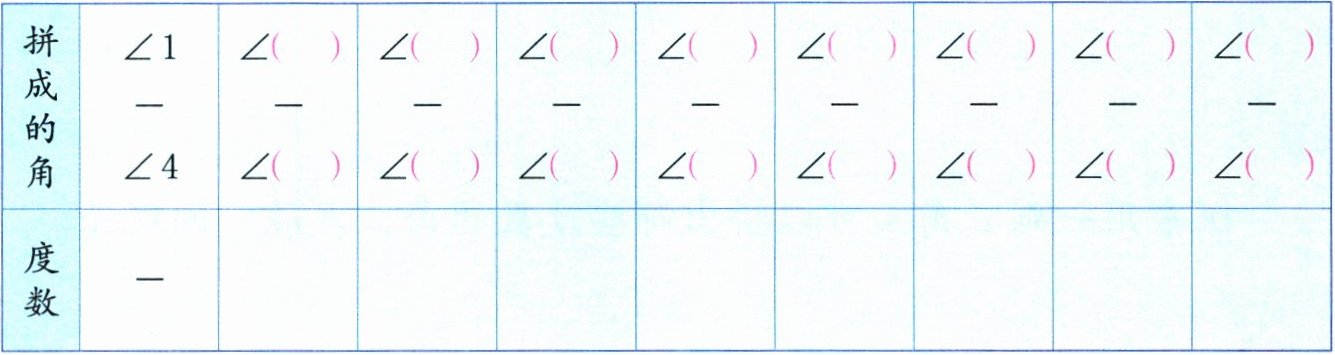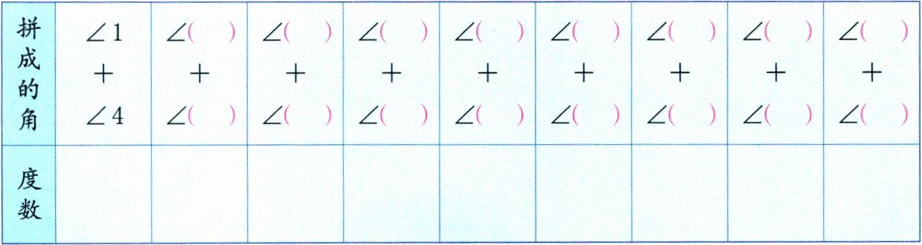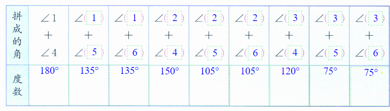 (1)将上面左边三角尺上的每一个角分别与右边三角尺上的每一个角拼在一起,算一算拼成的角是多少度,记录在表格里。
