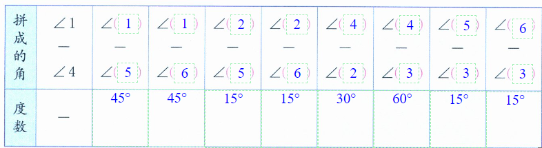 (2)将两块三角尺上的大小不同的两个角重叠起来,用大角减去小角,看看还能得到哪些度数的角。