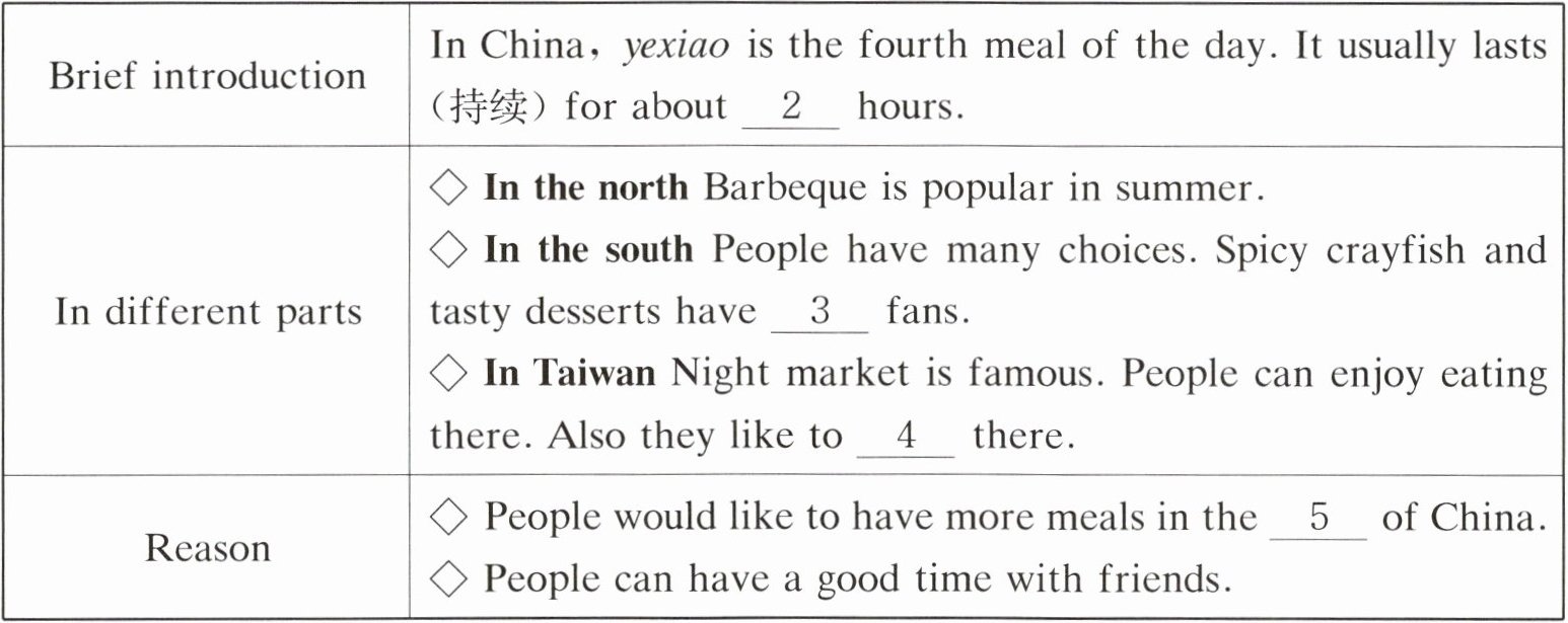 Night snacks:$a _1_ of life$| Brief introduction | In China,yexiao is the fourth meal of the day. It usually lasts(持续$)for about _2_ hours. $|